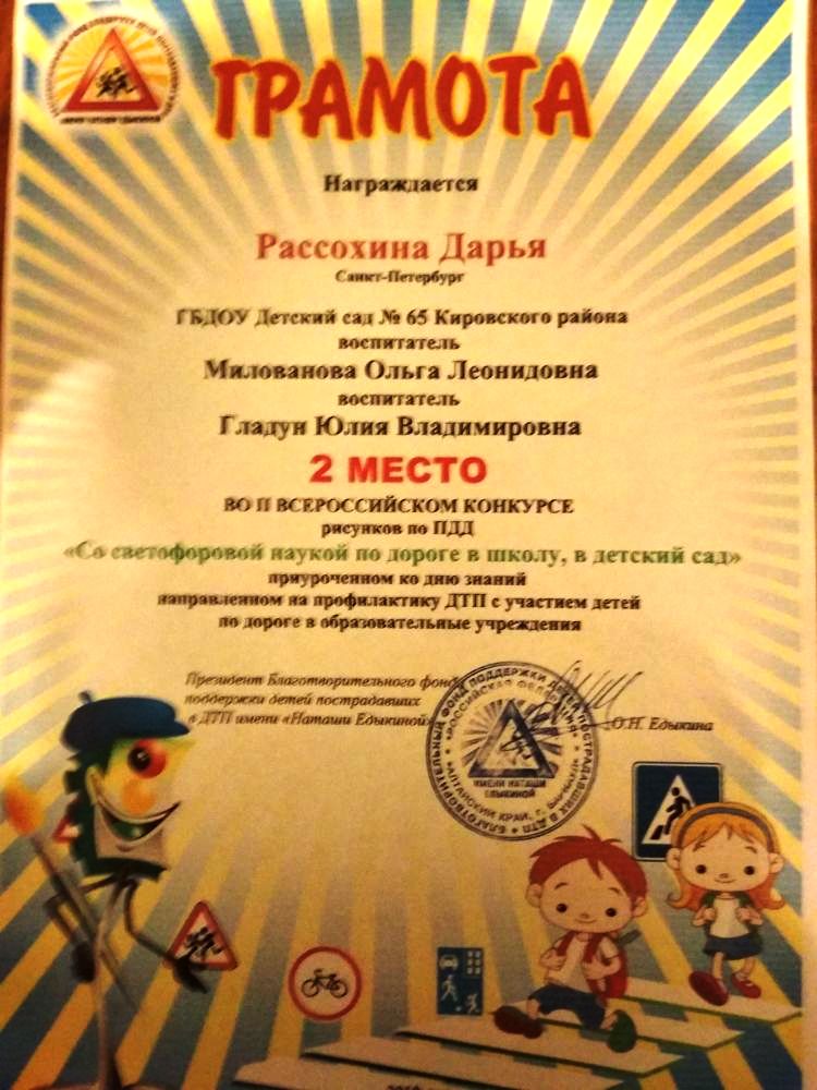- Всероссийский конкурс рисунков по ПДД «Со светофорной наукой по дороге в школу, детский сад» (2019 год), 2 место, грамота участника