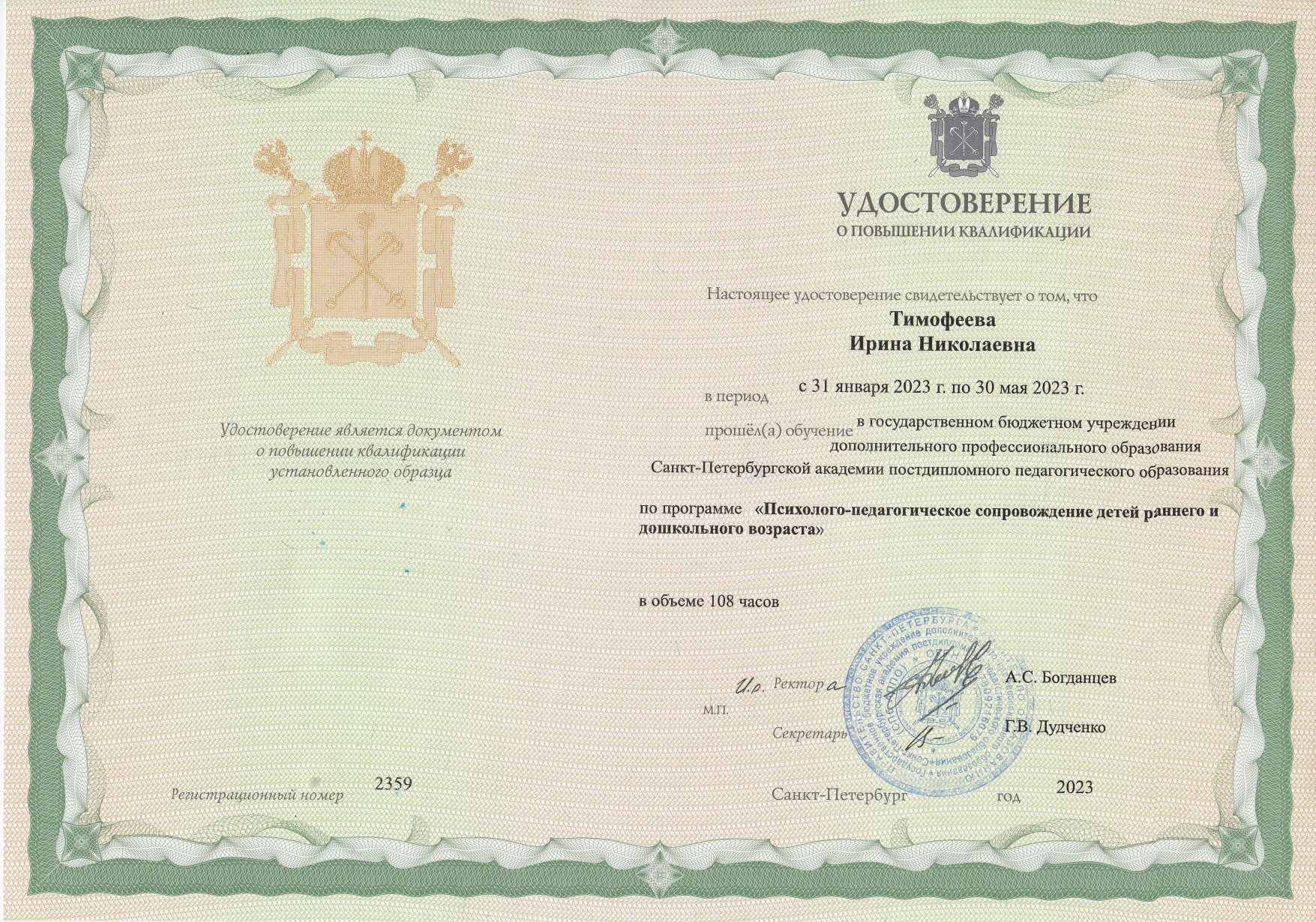 - Повышение квалификации 30.06.2020г. «НПФ «Институт профессиональной подготовки и повышения квалификации» по программе: «ФГОС ДО: применение игровых практик для современного развития детей"